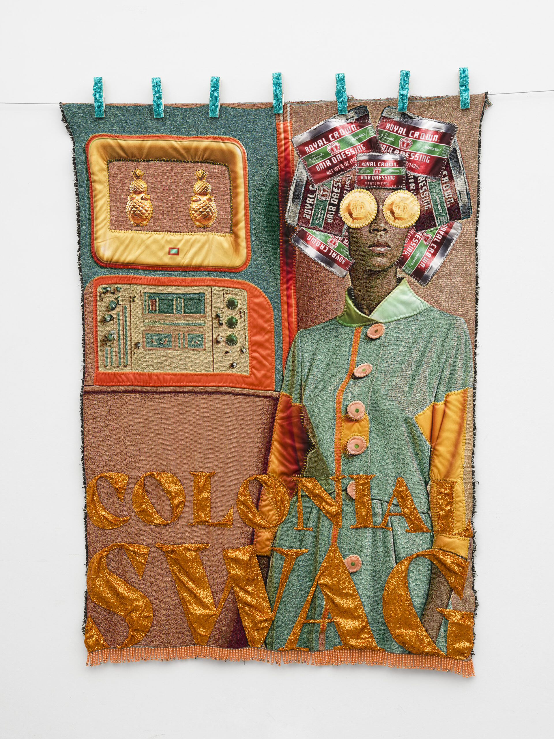 ![This image depicts an artwork by April Bey titled "COLONIAL SWAG: Here's to You and Here's to Us, if it Weren't for Pussy, Our Pussy Would Rust!." This artwork was created in 2024 and measures 48" x 36" x 3 ¹⁄₂" [HxWxD] (121.92 x 91.44 x 8.89 cm). Its medium is Canvas, crushed velour and woven jacquard textile hand sewn into resin, glitter on panel.](https://vielmetter.com/wp-content/uploads/2024/05/April-Bey_BEY1046_1715386668-768x1024.jpg)