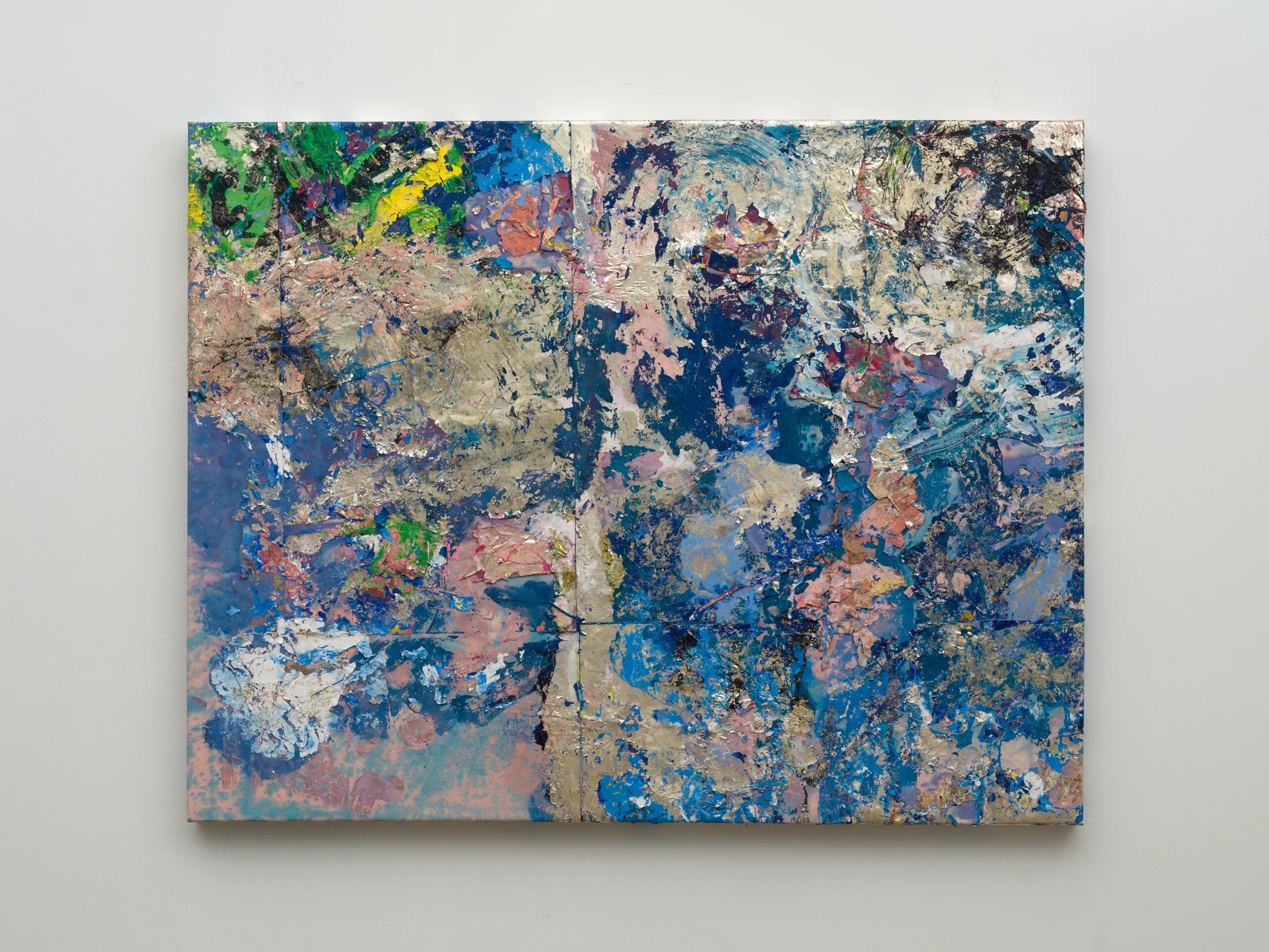 Acrylic paint, silver nitrate, glass on canvas mounted on panel