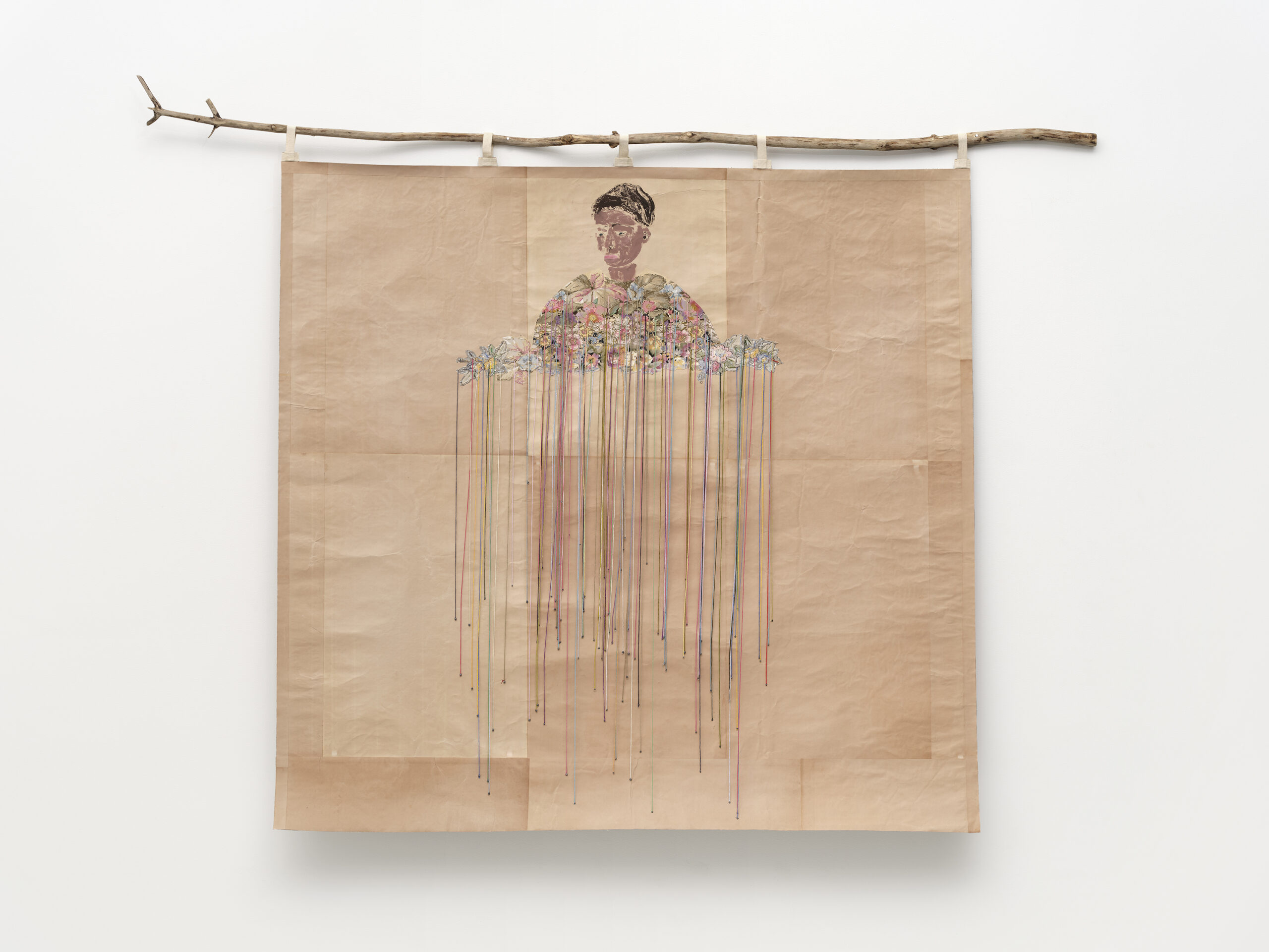 This image depicts an artwork by Lyne Lapointe titled "The Gardener." This artwork was created in 2025 and measures 61 ¹⁄₂" x 84" x 2 ¹⁄₂" [HxWxD] (156.21 x 213.36 x 6.35 cm). Its medium is Ink on papier d’Arménie, linen, antique tapestry, embroidery thread, wooden branch and little lead weight.