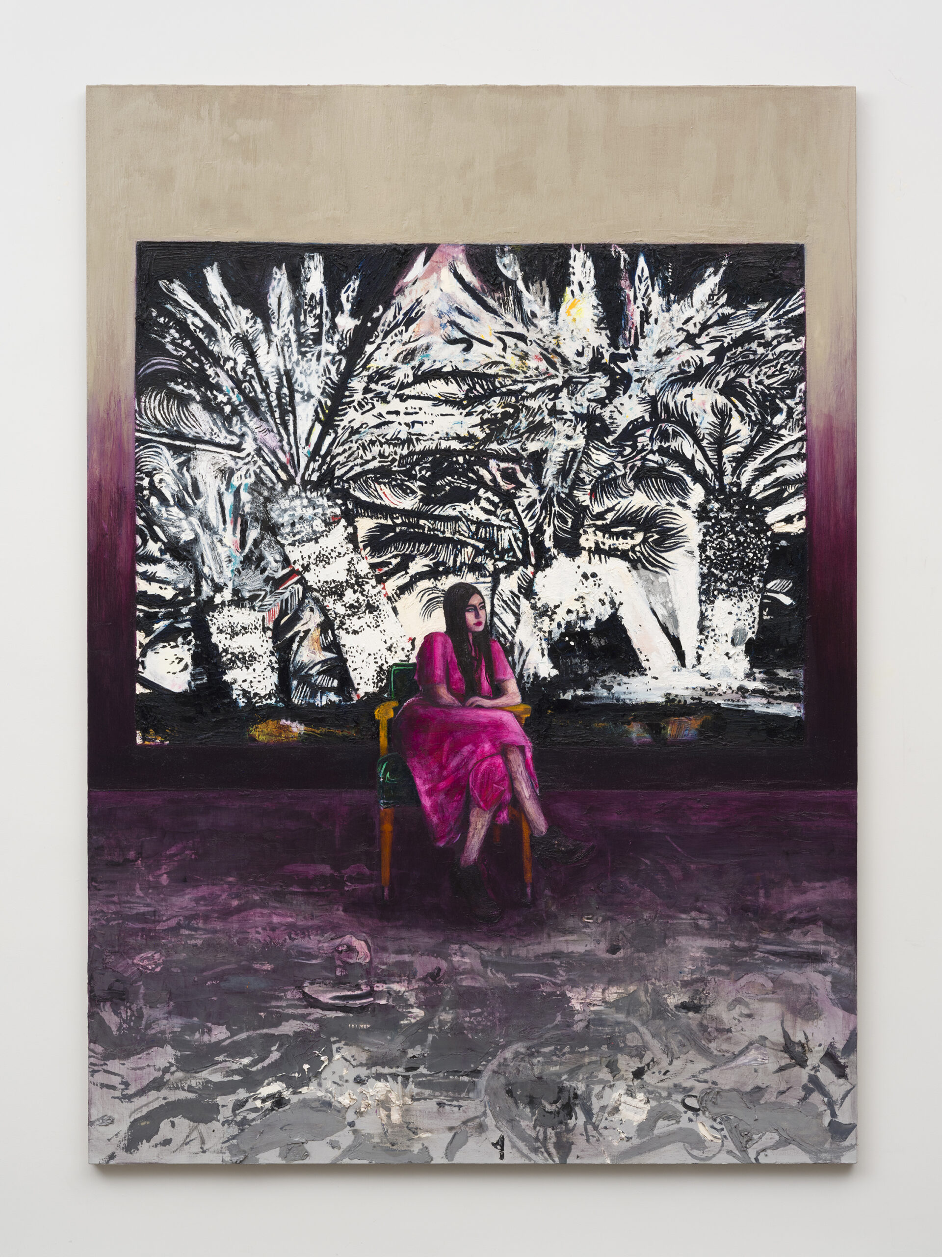 Raffi Kalenderian’s painting practice centers around portraiture, and explores the possibilities of representation and individuality. Most widely known for his colorfully saturated portraits painted from life, Kalenderian’s work highlights both the psychological state of his sitters and the formal possibilities of their clothing, appearance, and environment. The paintings are composed to establish a tension between the often densely rendered surroundings that the sitter occupies and their solitude. He often paints the people he is closest with, his friends, family, significant others, and the resulting images convey the intimacy they share. In many works, the subjects of his paintings are the focal point, but the background is charged in such a way that it becomes like an extension or secondary representation of that individual. The combination of the flatness of Kalenderian’s works, the off-kilter perspective, and the contrasting colors all create a nonhierarchical composition, suggesting that the armchair a person sits on, for instance, is also permeated by the individual’s psychological state. In recent years, Kalenderian has pursued painting landscapes, equally as expressive and emotive as his portrait paintings, the heavily saturated foliage and mountainscapes are imbued with the presence of another being.