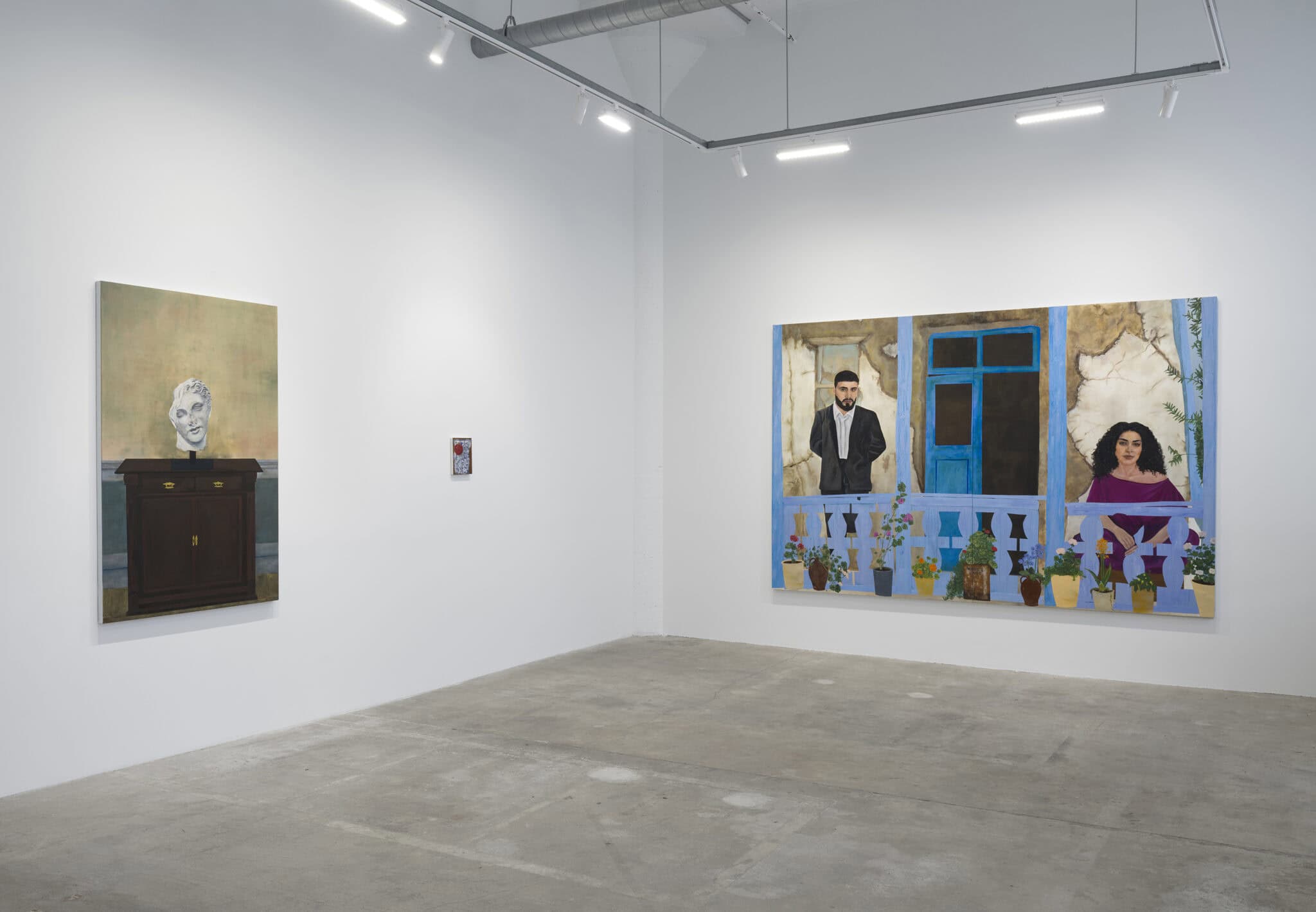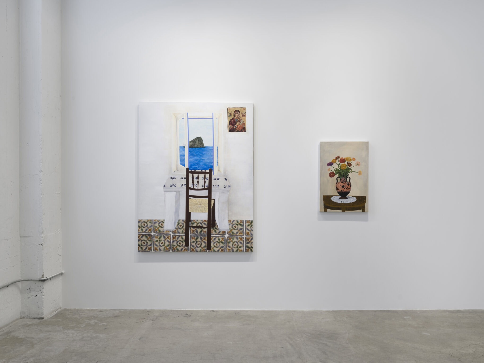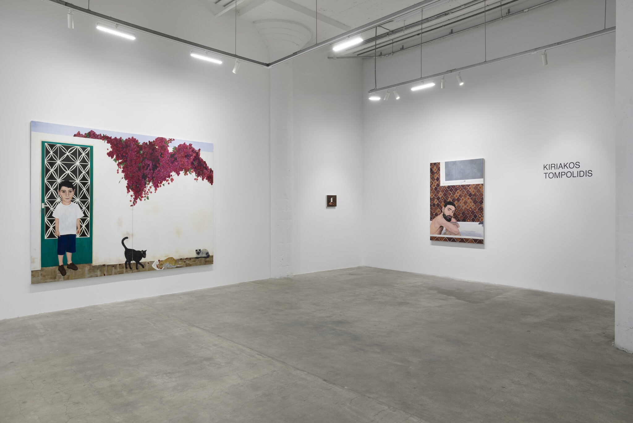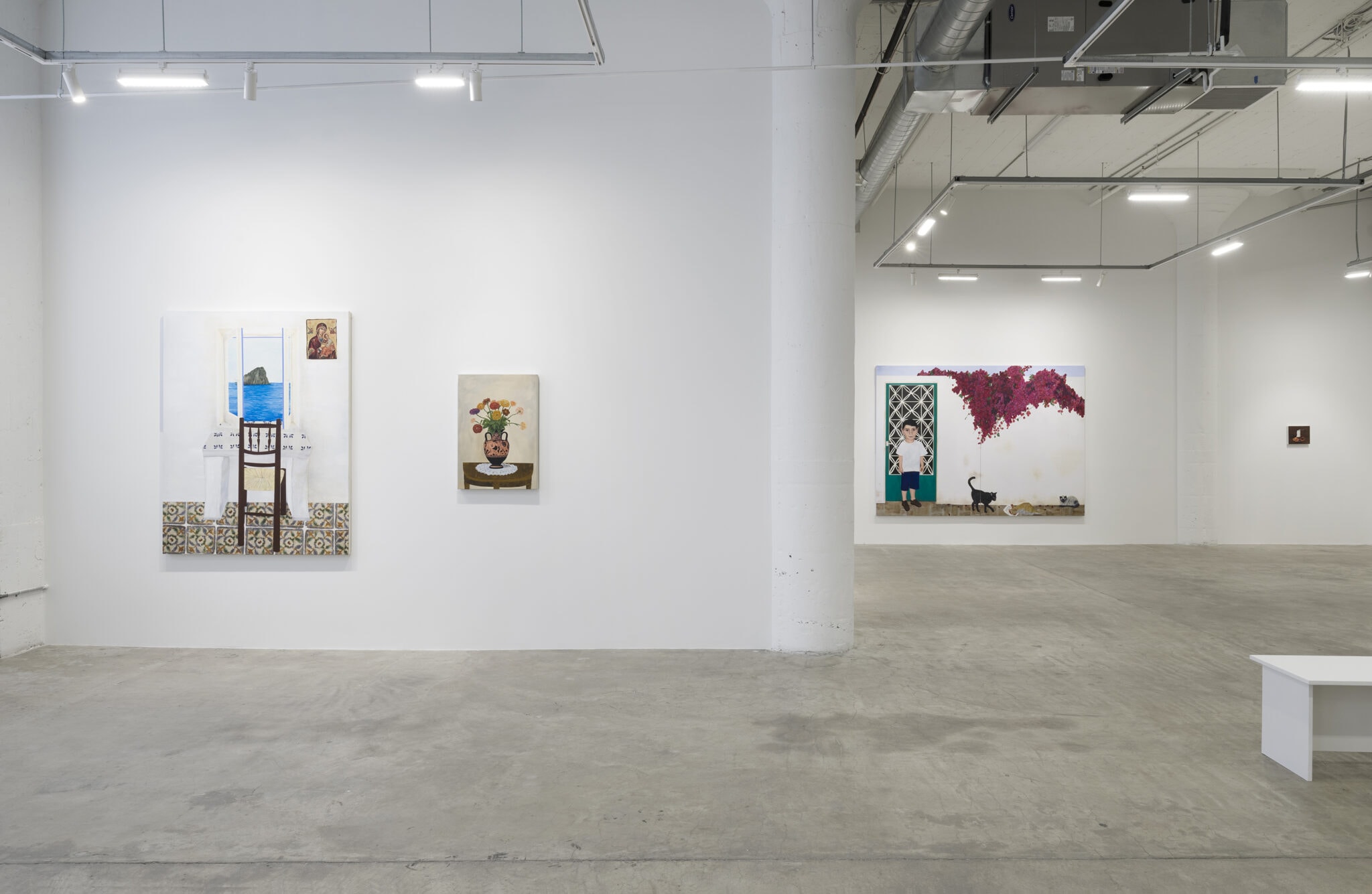 Tompolidis’ paintings occupy an ambiguous and atemporal space that draws from family histories, lived experience, and dreams, and that is made tangible through intricately rendered textures and surface treatments. Patterns in textiles, architecture, and nature function as signifiers of place, time, and cultural context. In the work Her Reflection Tompolidis depicts his grandmother as a young woman, capturing her pensive smile in the mirror of her vanity and the small cross necklace and family portrait sitting atop her dresser. The artist’s grandmother reappears in the titular work Your Tears Will Dry, a trompe l’oeil painting of the back of a canvas inscribed with the phrase she often repeated, and which was formative in his understanding of perseverance. Some of the paintings present an unvarnished realism while others teeter into the surreal, so that collectively they offer a richly detailed view of a space between reality and recollection.