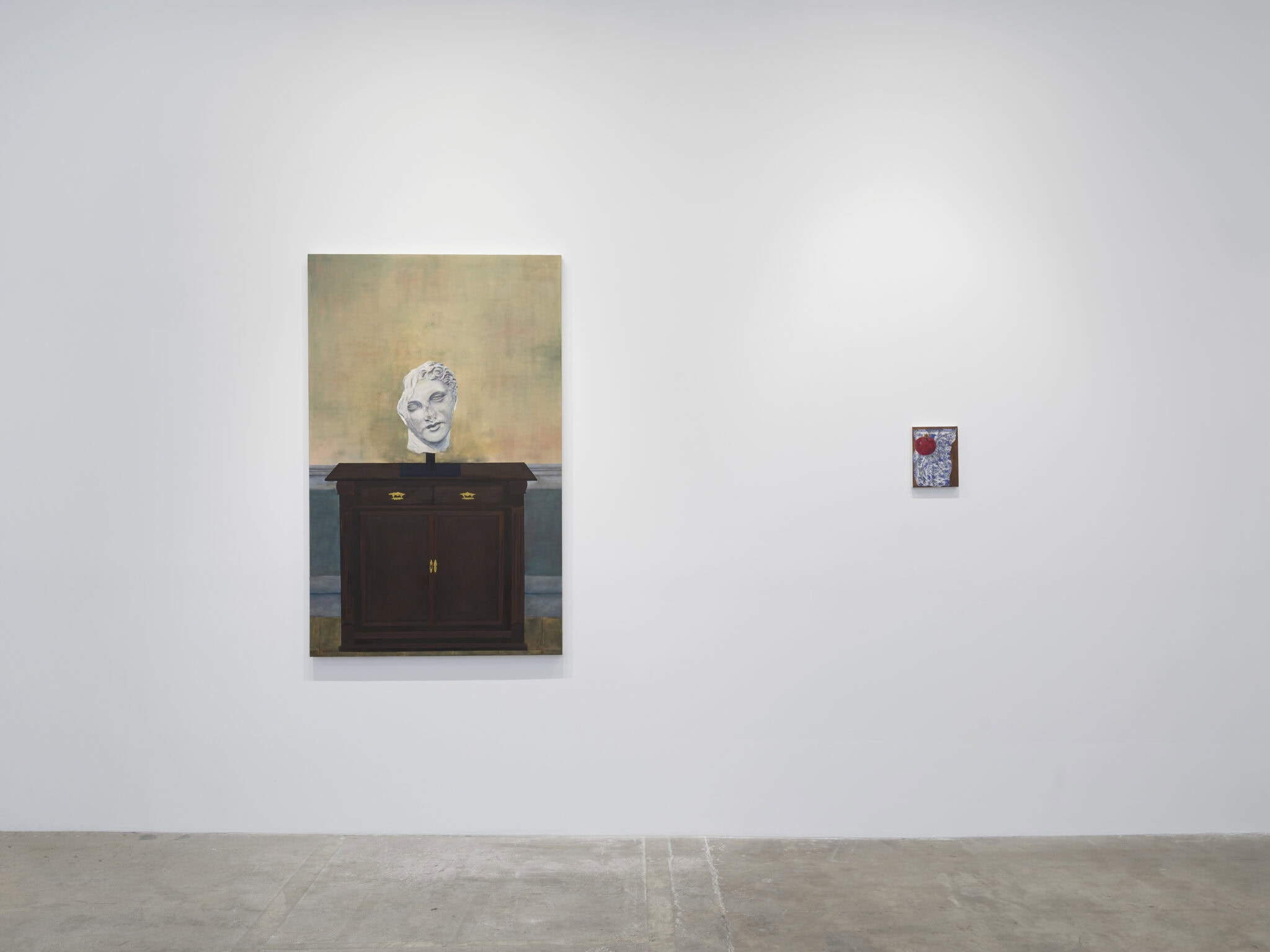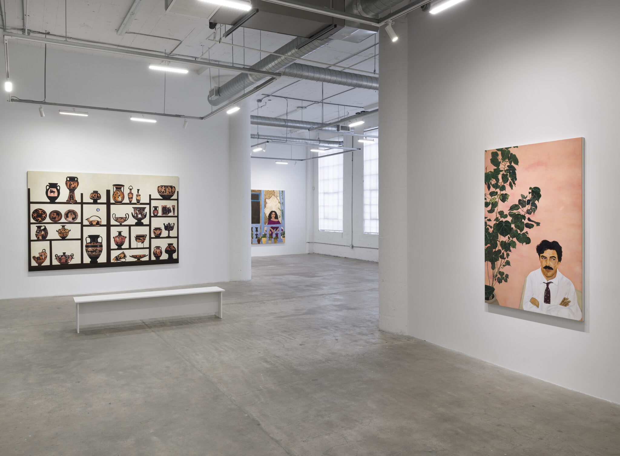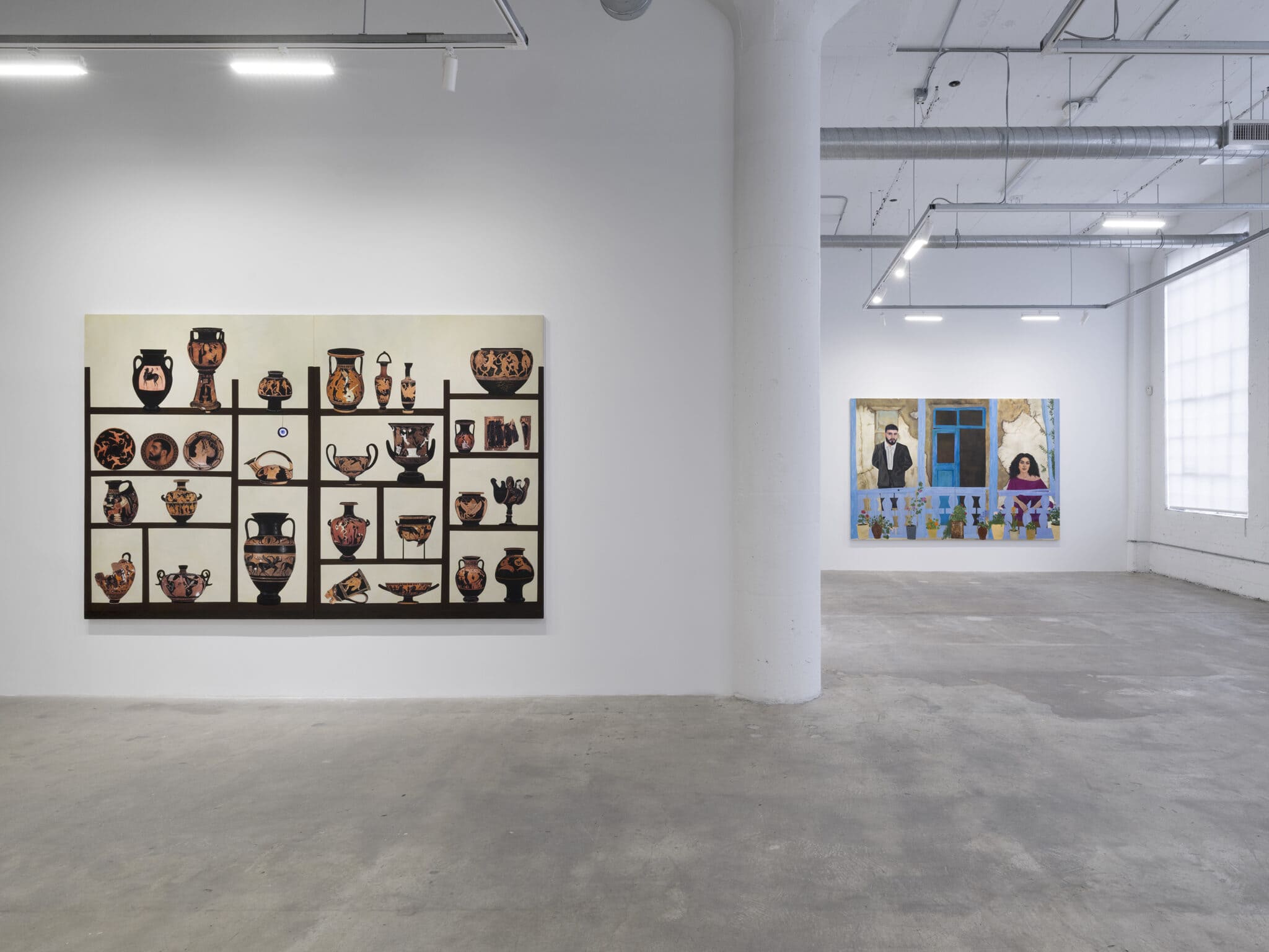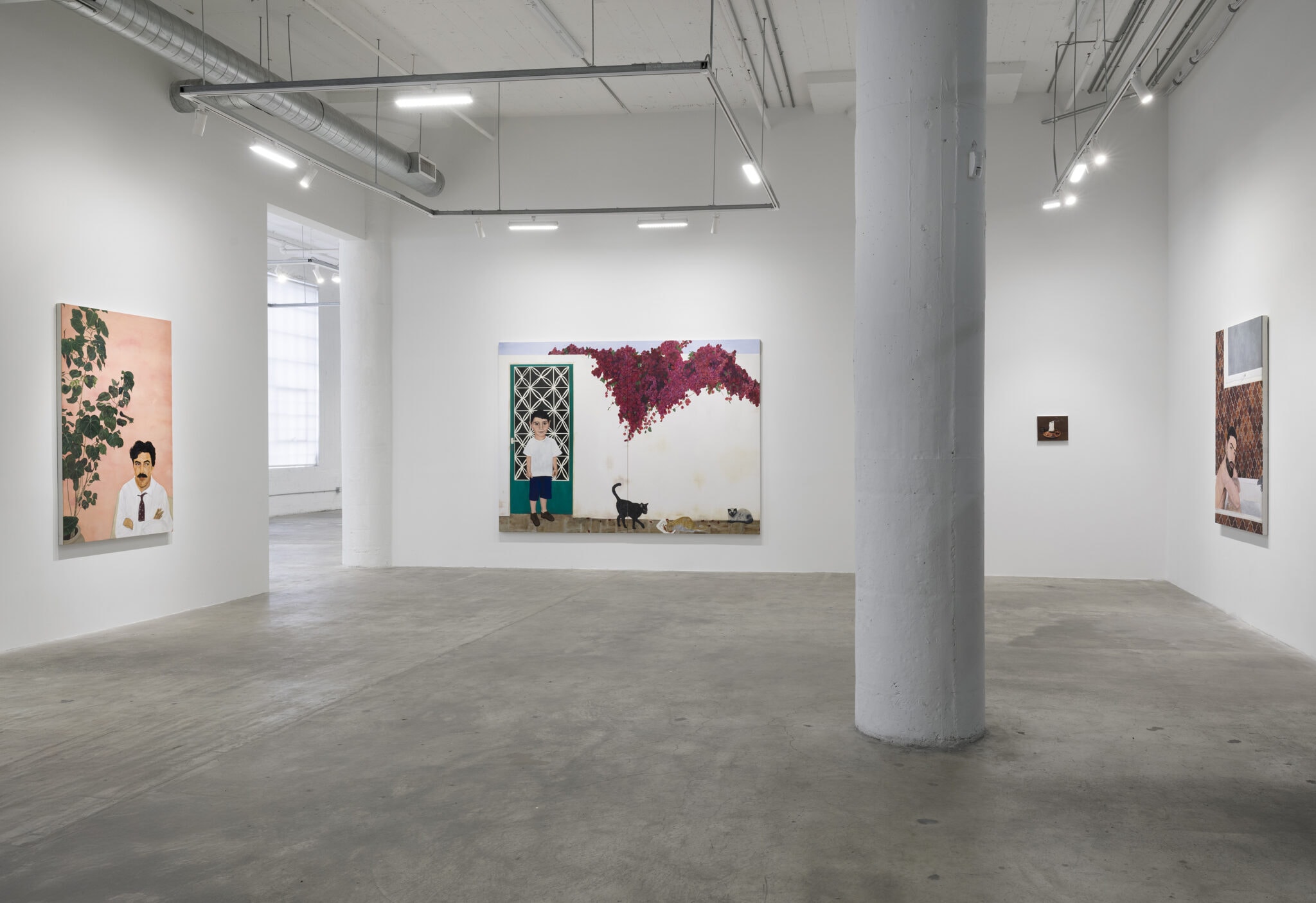 Tompolidis’ paintings occupy an ambiguous and atemporal space that draws from family histories, lived experience, and dreams, and that is made tangible through intricately rendered textures and surface treatments. Patterns in textiles, architecture, and nature function as signifiers of place, time, and cultural context. In the work Her Reflection Tompolidis depicts his grandmother as a young woman, capturing her pensive smile in the mirror of her vanity and the small cross necklace and family portrait sitting atop her dresser. The artist’s grandmother reappears in the titular work Your Tears Will Dry, a trompe l’oeil painting of the back of a canvas inscribed with the phrase she often repeated, and which was formative in his understanding of perseverance. Some of the paintings present an unvarnished realism while others teeter into the surreal, so that collectively they offer a richly detailed view of a space between reality and recollection.