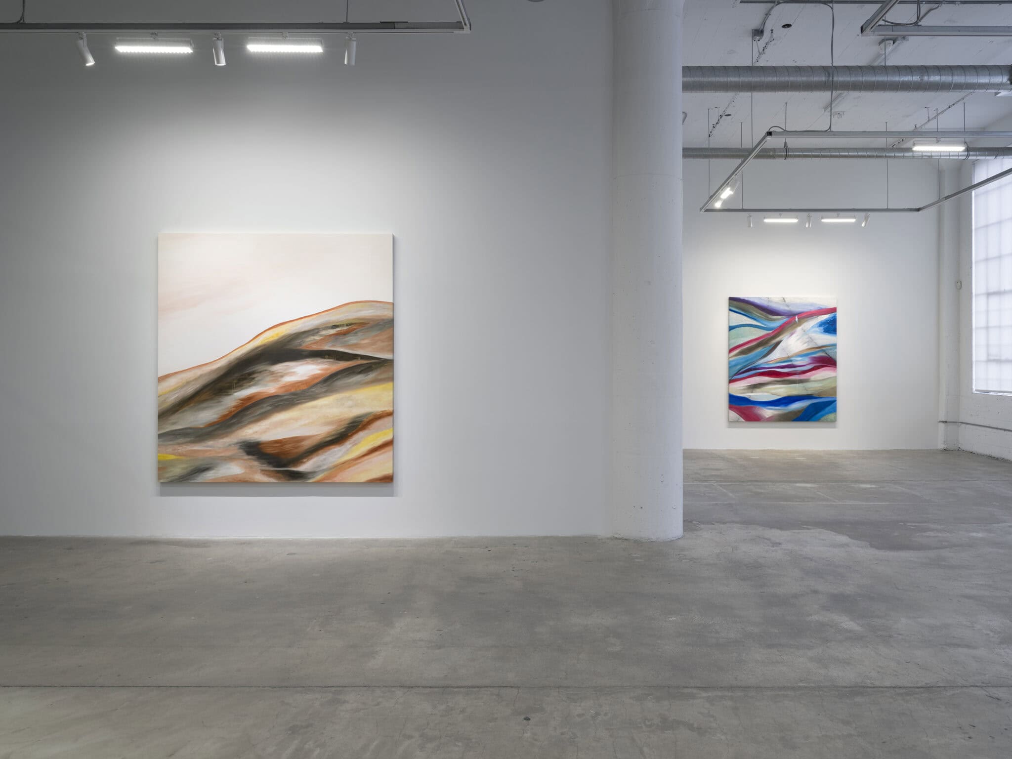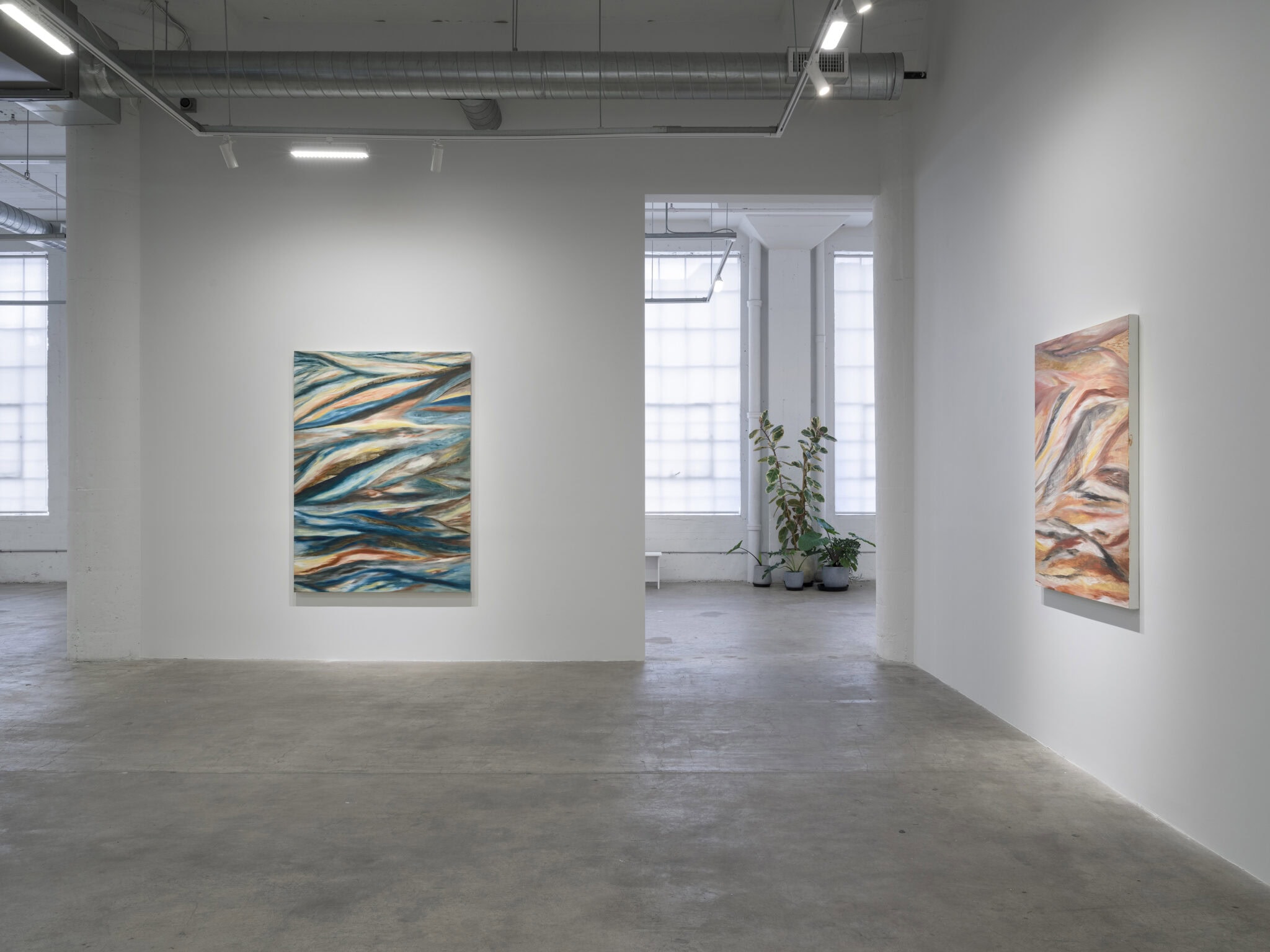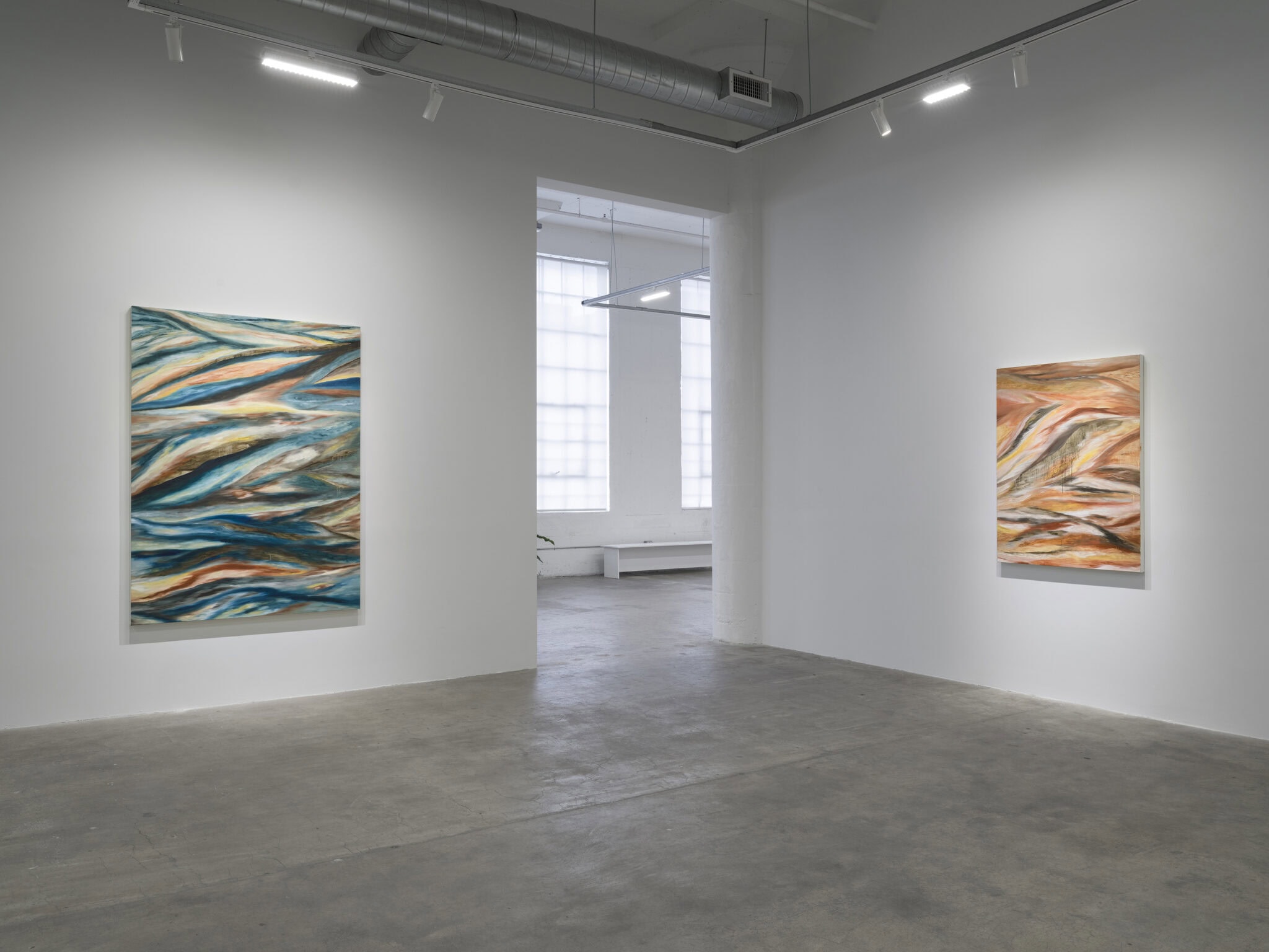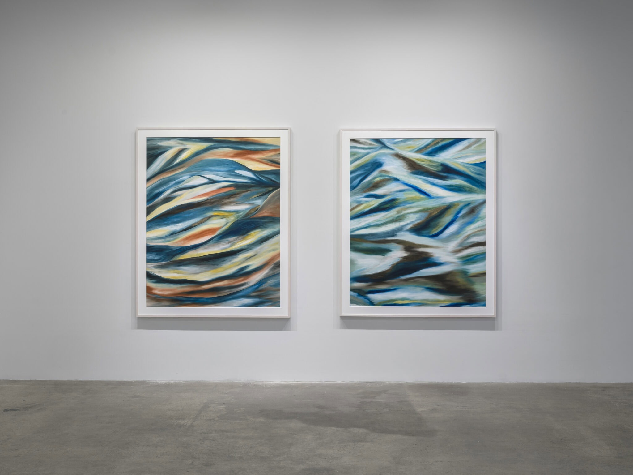 Currents of blue and ochre reminiscent of geological strata or tidal cycles flow alongside ribbons of crimson and gold, the colors of sun on the horizon. Drips trace fractures in the surface, illustrating the dynamism and instability of matter in its changing states. Malik’s paintings animate the shifting and porous relationship between body and landscape as figure and ground coalesce.