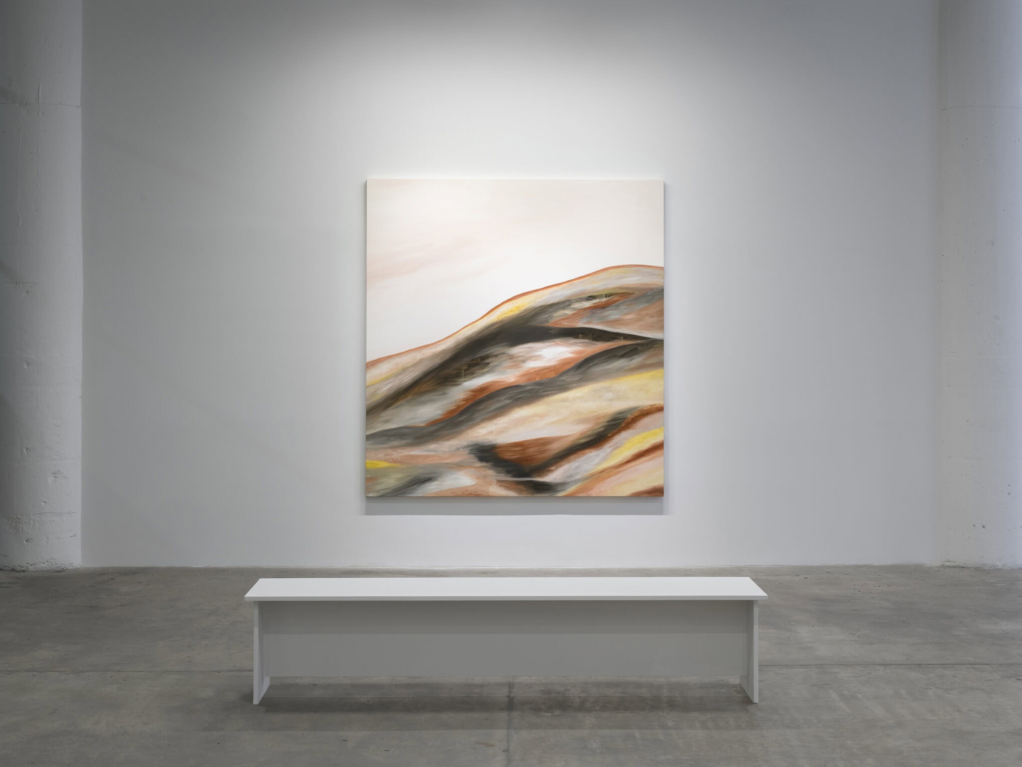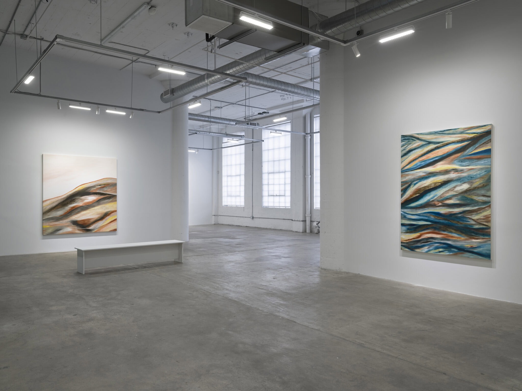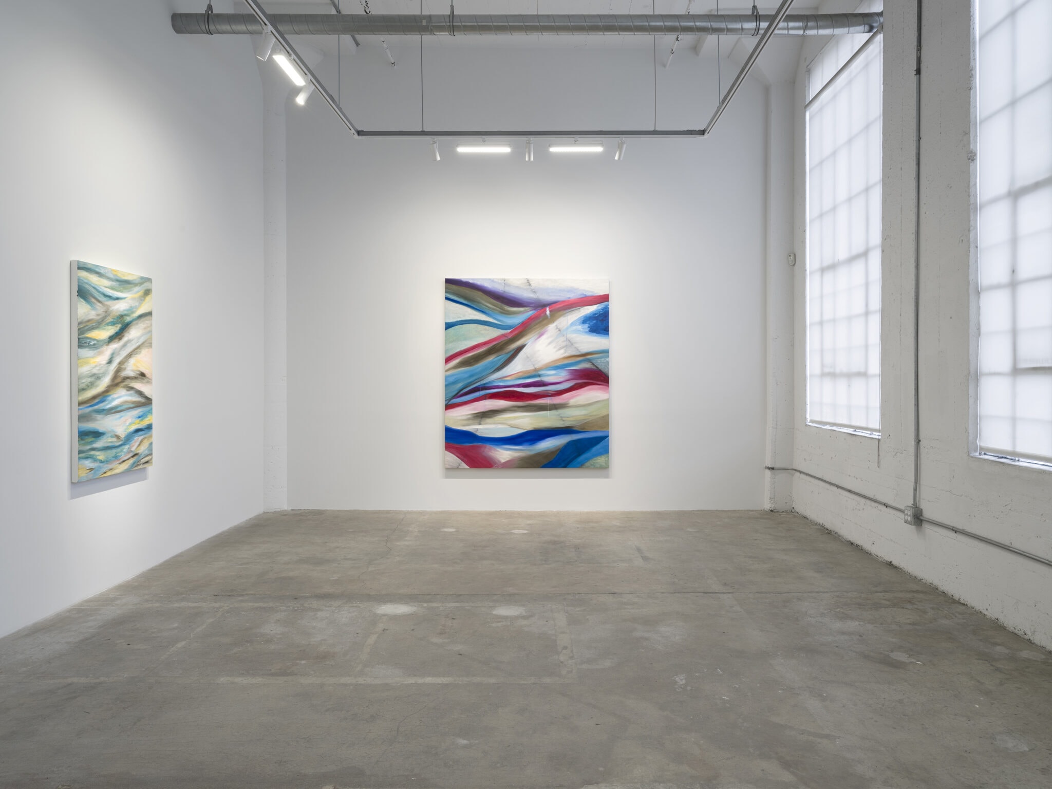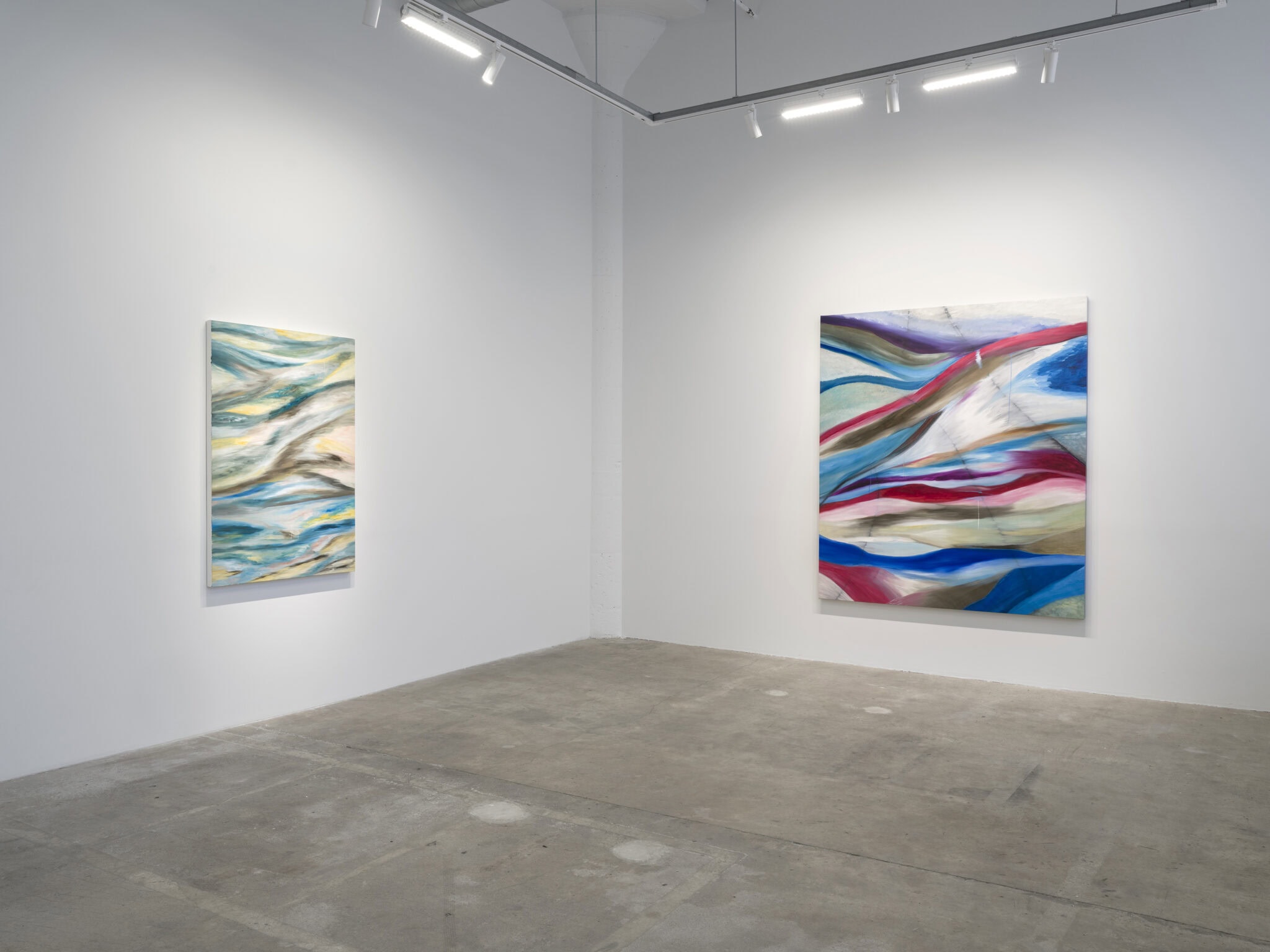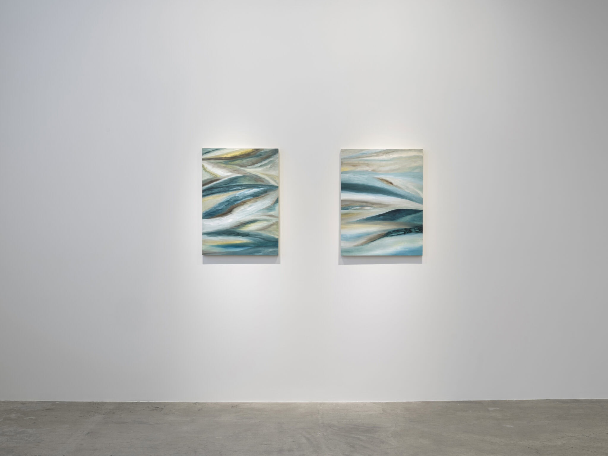 The sweeping curves, bright glints of light, and surging swathes of color call to mind aerial views of a dramatic landscape below – sea and land are fused and cleaved by sinuous lines that weave through the compositions. Malik’s layered strokes and dissolving edges refuse fixed form and suggest an undercurrent of energy moving beneath the visible surfaces of the paintings. She translates the landscapes of her recent journeys into gestural abstractions that carry the imprint of memory and place, from the austere and icy expanse of Antarctica to the dense forests of Uruguay and the serene stillness of the Berkshires in winter.