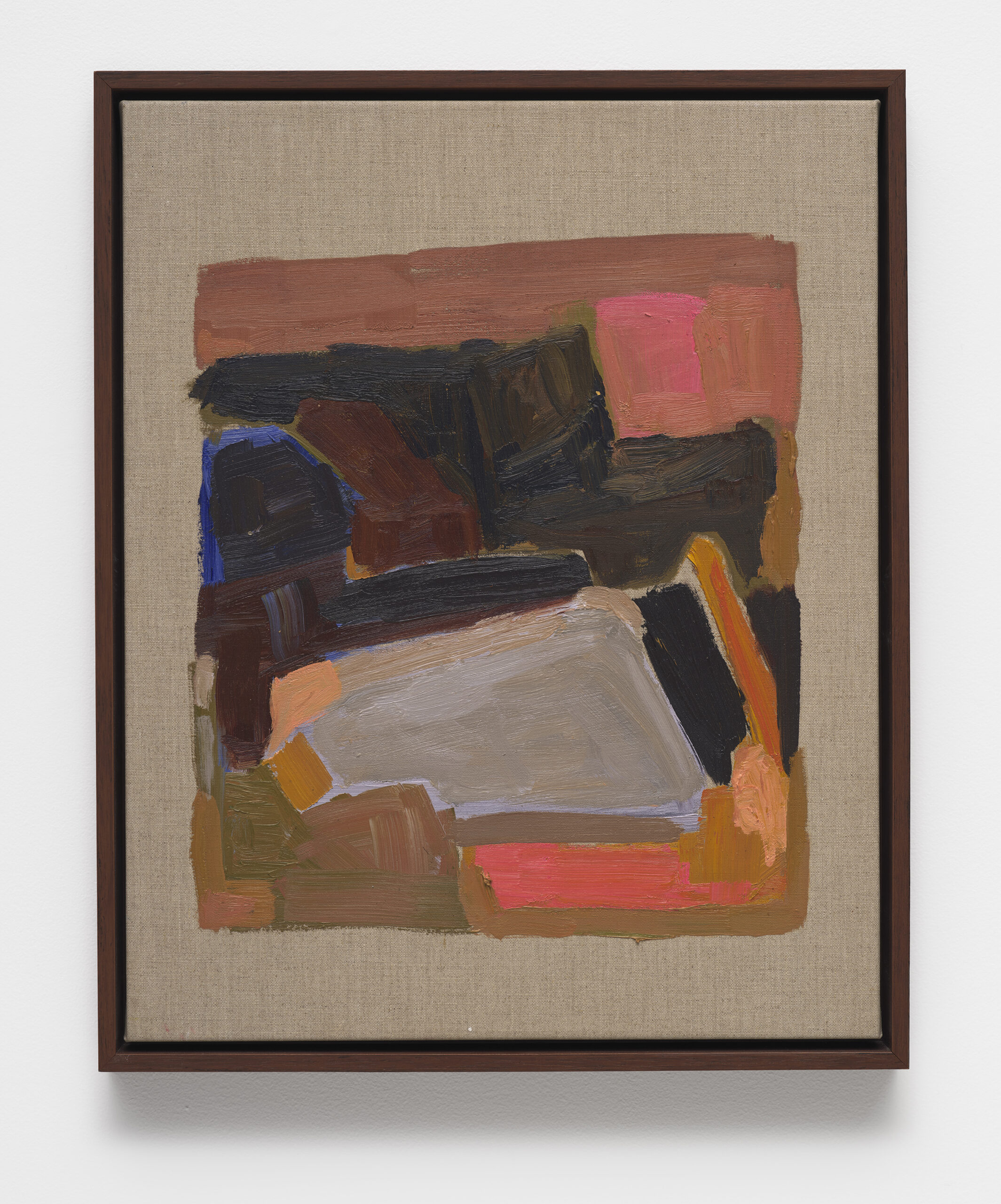 At the center of the grouping, a large work titled Spring is Here alludes to a desert horizon with softly modeled geometric forms in shades of cream and charcoal, punctuated by earthy greens, browns, and pinks. The smaller paintings, created while the artist was healing from an injury, convey a slower rhythm and are encircled by a border of raw linen. Gestural brush strokes and planes of color converge to form impressions of a house, a skyline, and a desert garden.