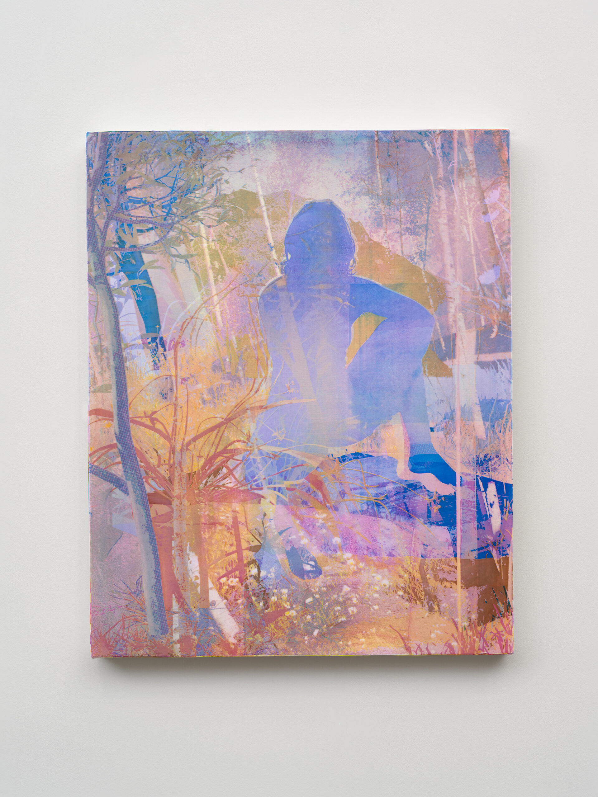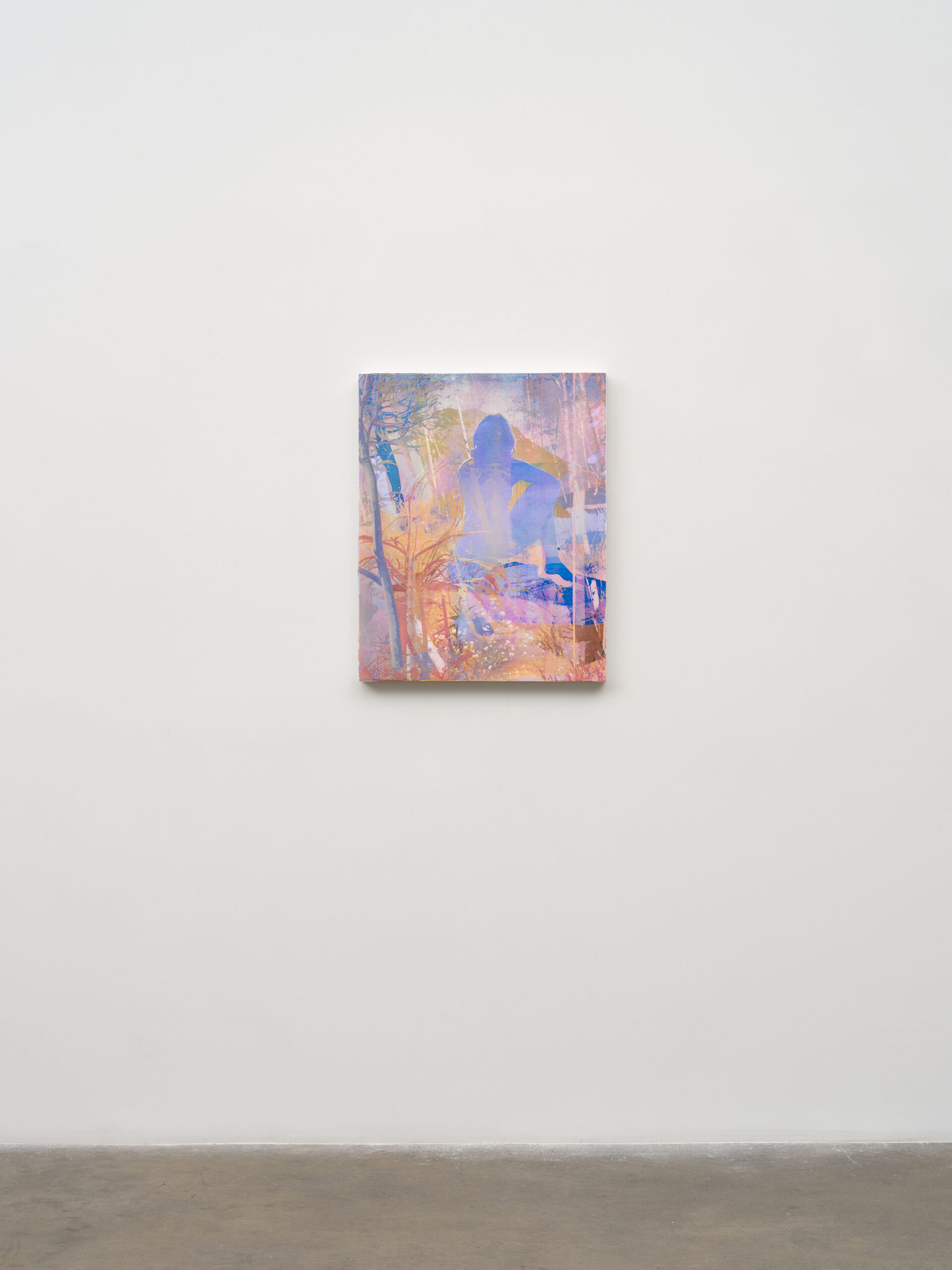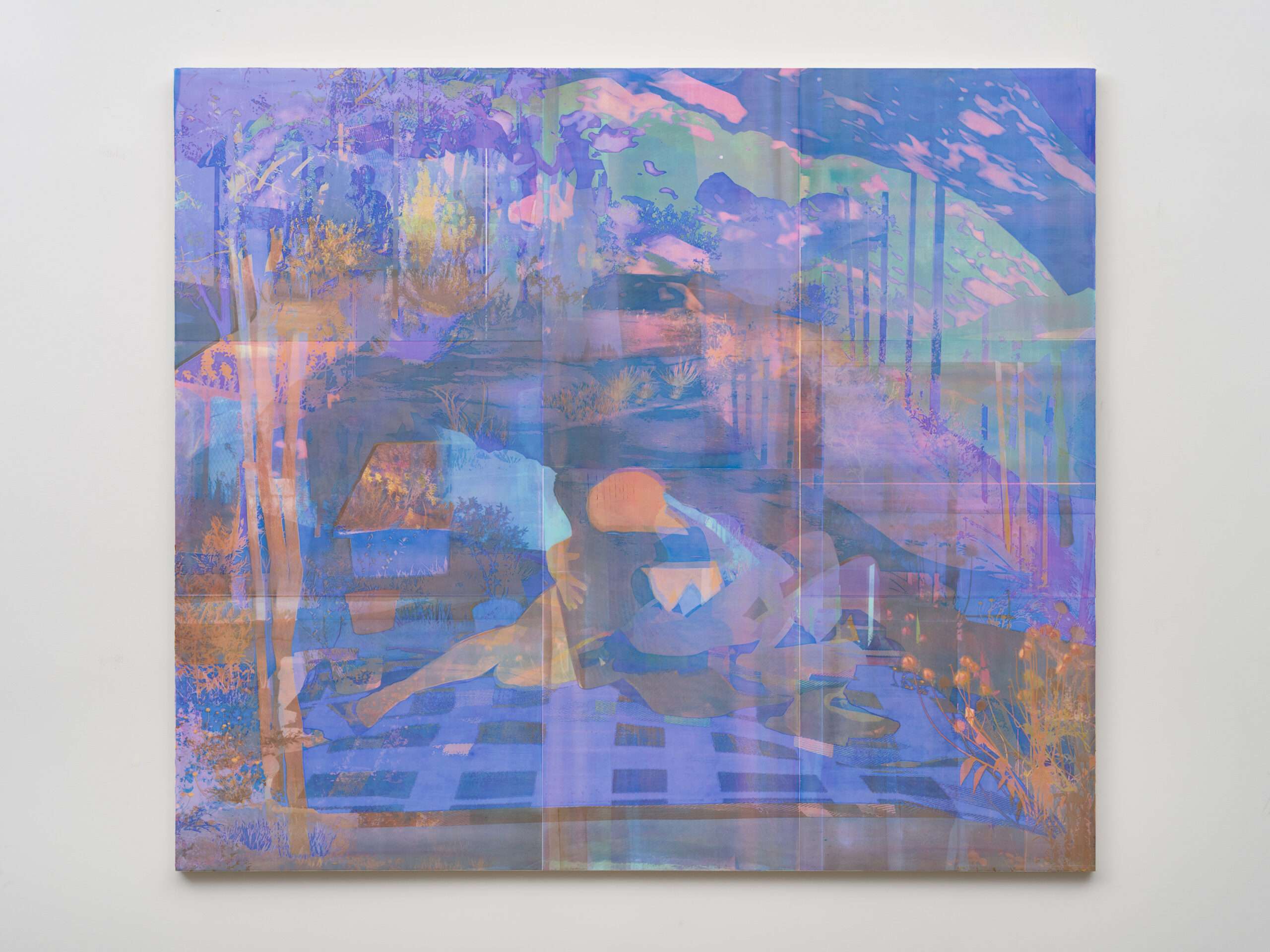 Throughout the compositions, Walsh merges images of contemporary figures – their friends, or themselves, for instance – alongside quotations of images from Pat Rocco, a queer photographer and activist who worked in Los Angeles in the 60s and 70s. This cross-generational image play is not immediately evident as Walsh’s figures are intentionally rendered as shadowy, transient, and unfixed in the landscapes they inhabit. Walsh’s technique of layering images through their stenciling and screen-printing process allows for a blending of surfaces, forms, and figures that evoke a convergence of time and space. Just when the image begins to become fixed, a slippage presents itself and details shimmer on the surface, coming in and out of focus. This approach evokes a perceptual in-between, leaving room for subjectivity in meaning and relational ambiguity that occupies a space between legibility and abstraction.