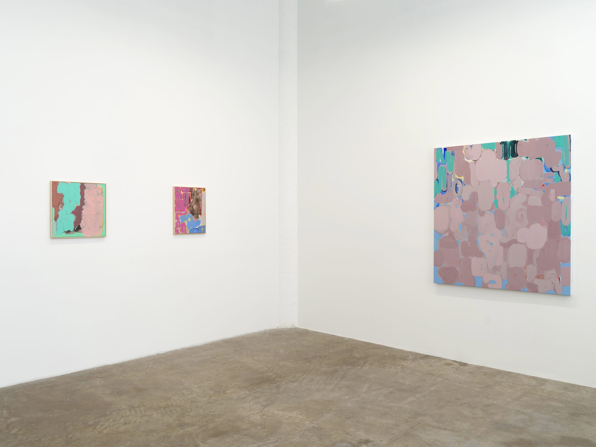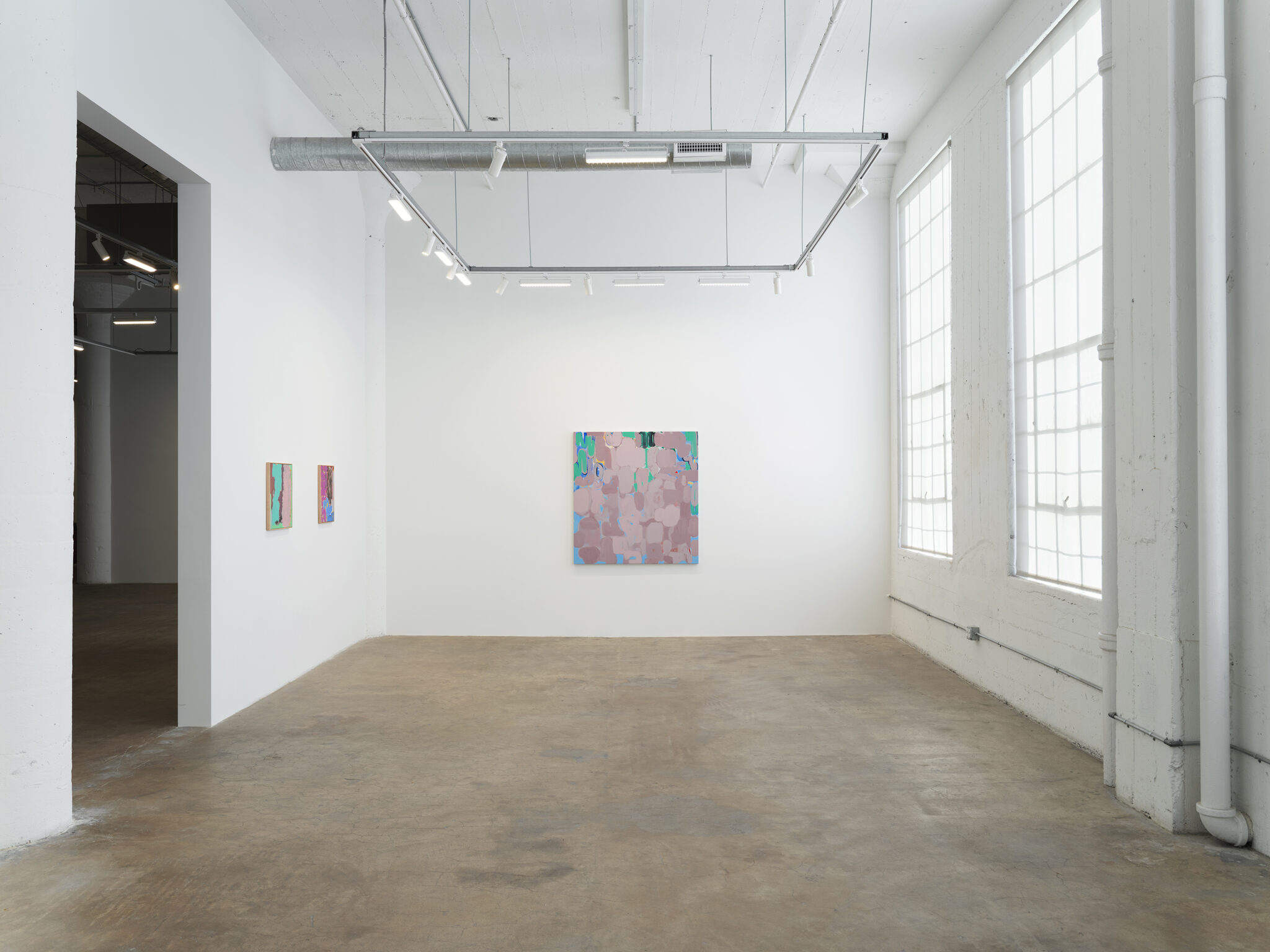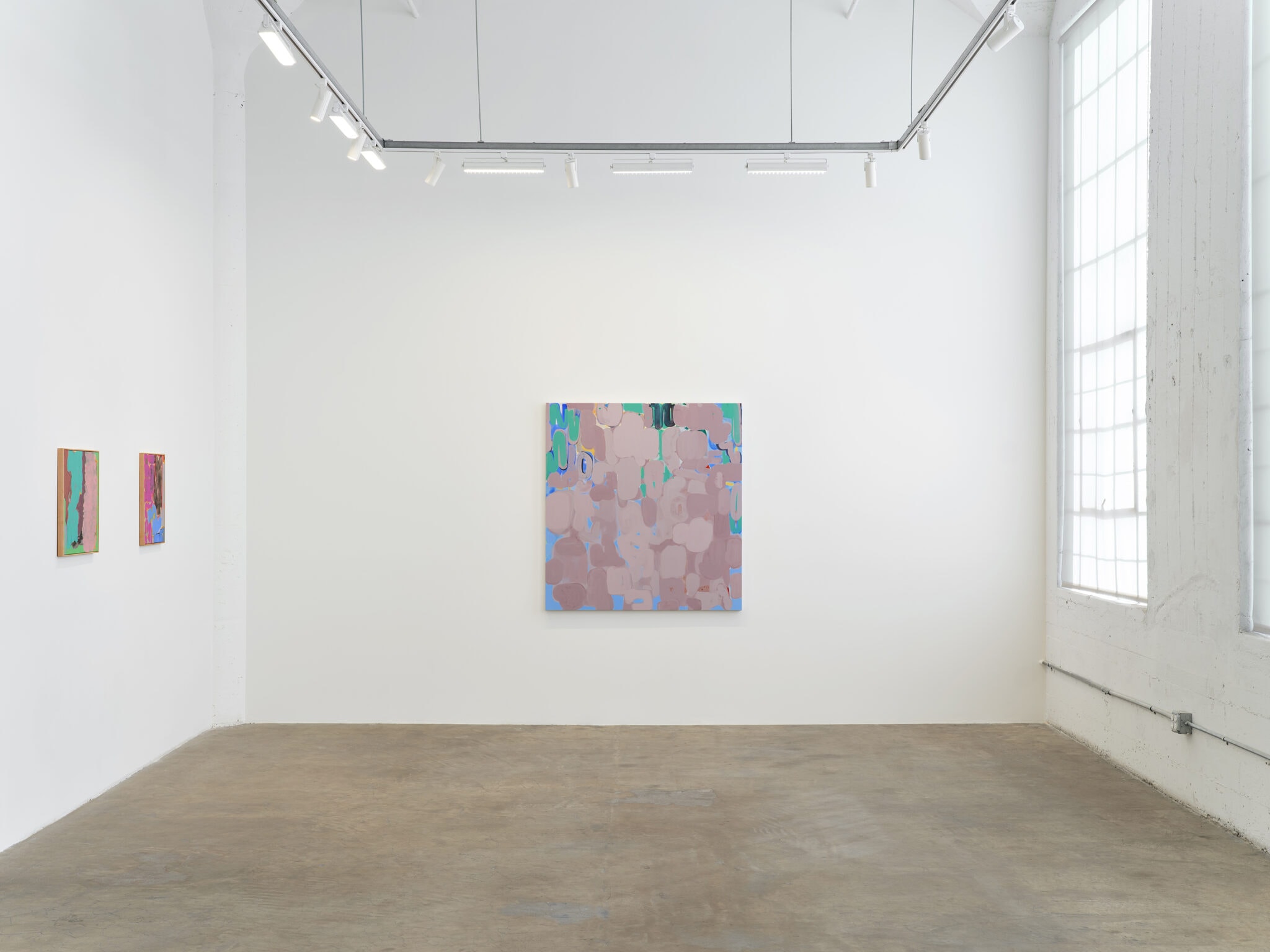Min continues an exploration of the material possibilities of mark-making, employing a variety of different applications: wet and dry brush strokes, pours, drips, and rolls. The amalgamation of these approaches creates complex relationships between figure and ground, where solids dissolve into formlessness and shapes materialize out of pure expanses.