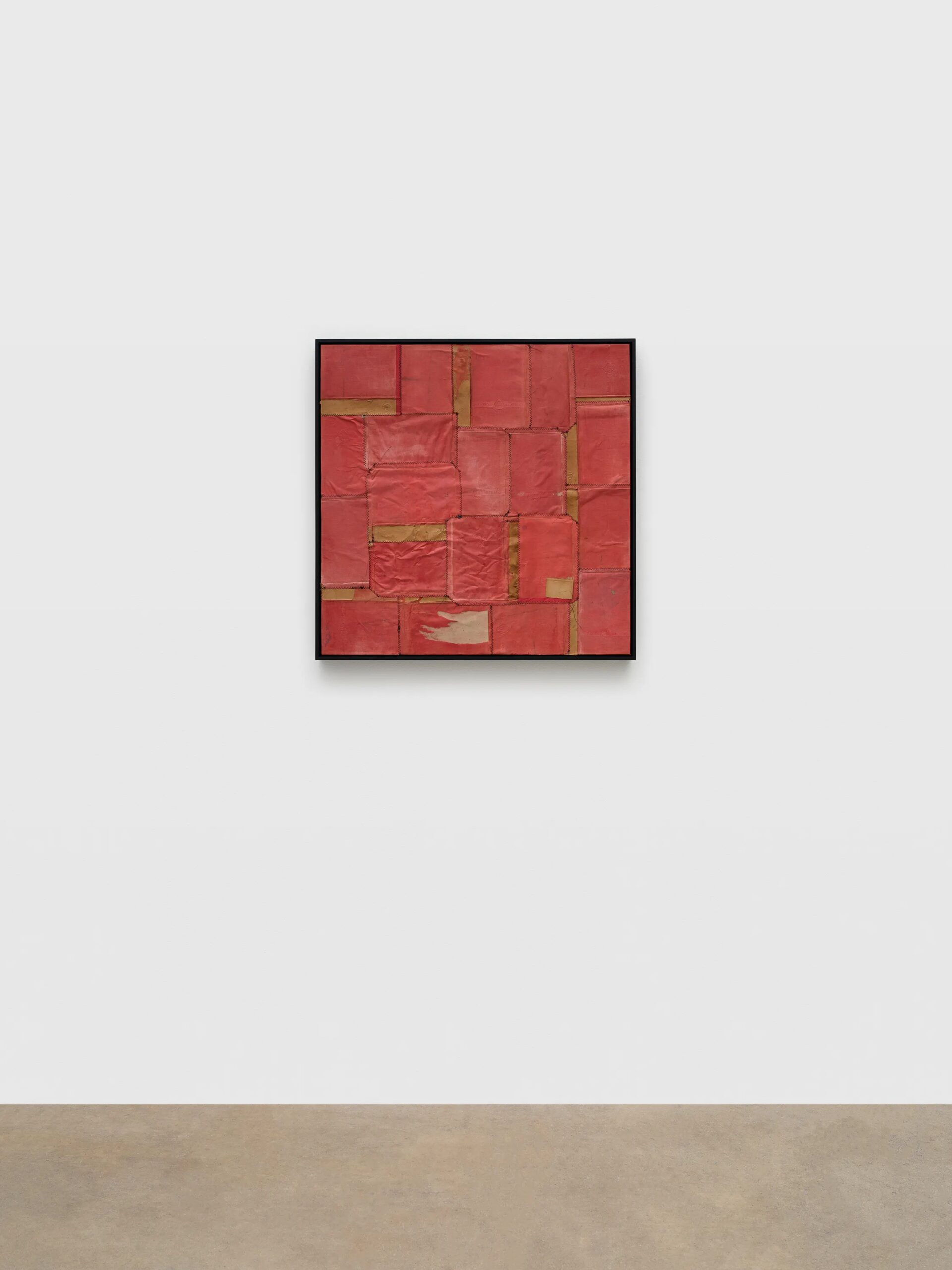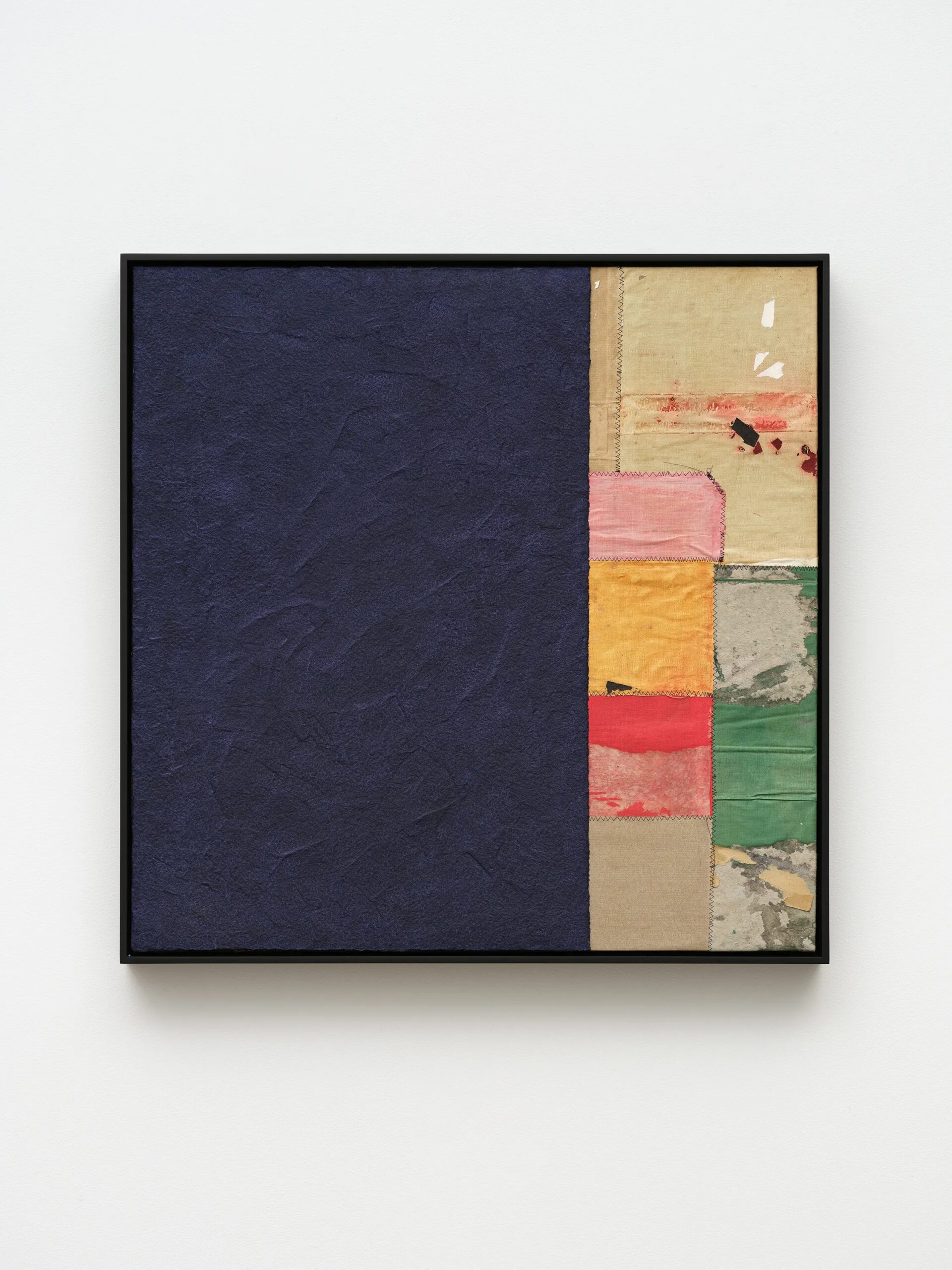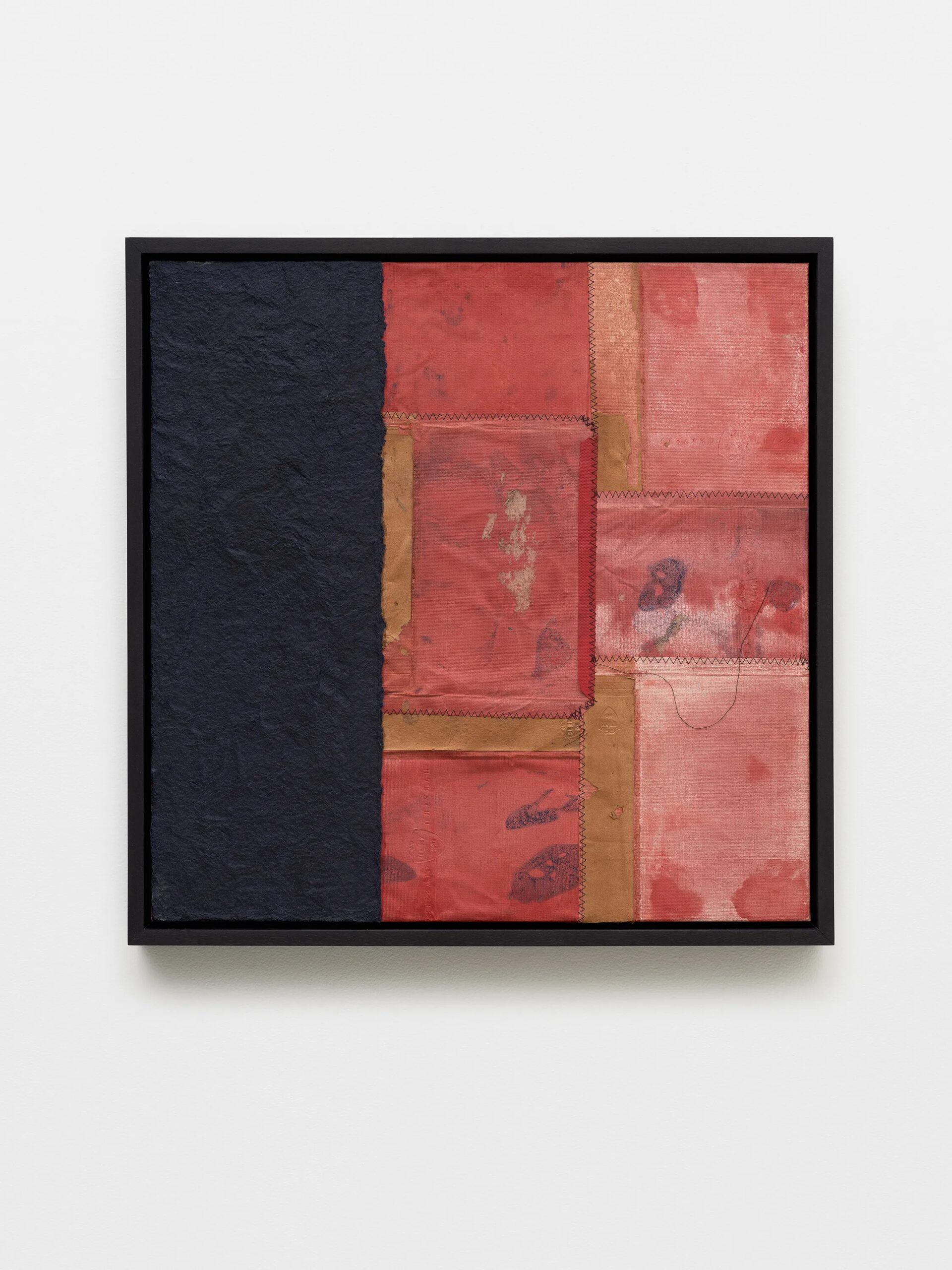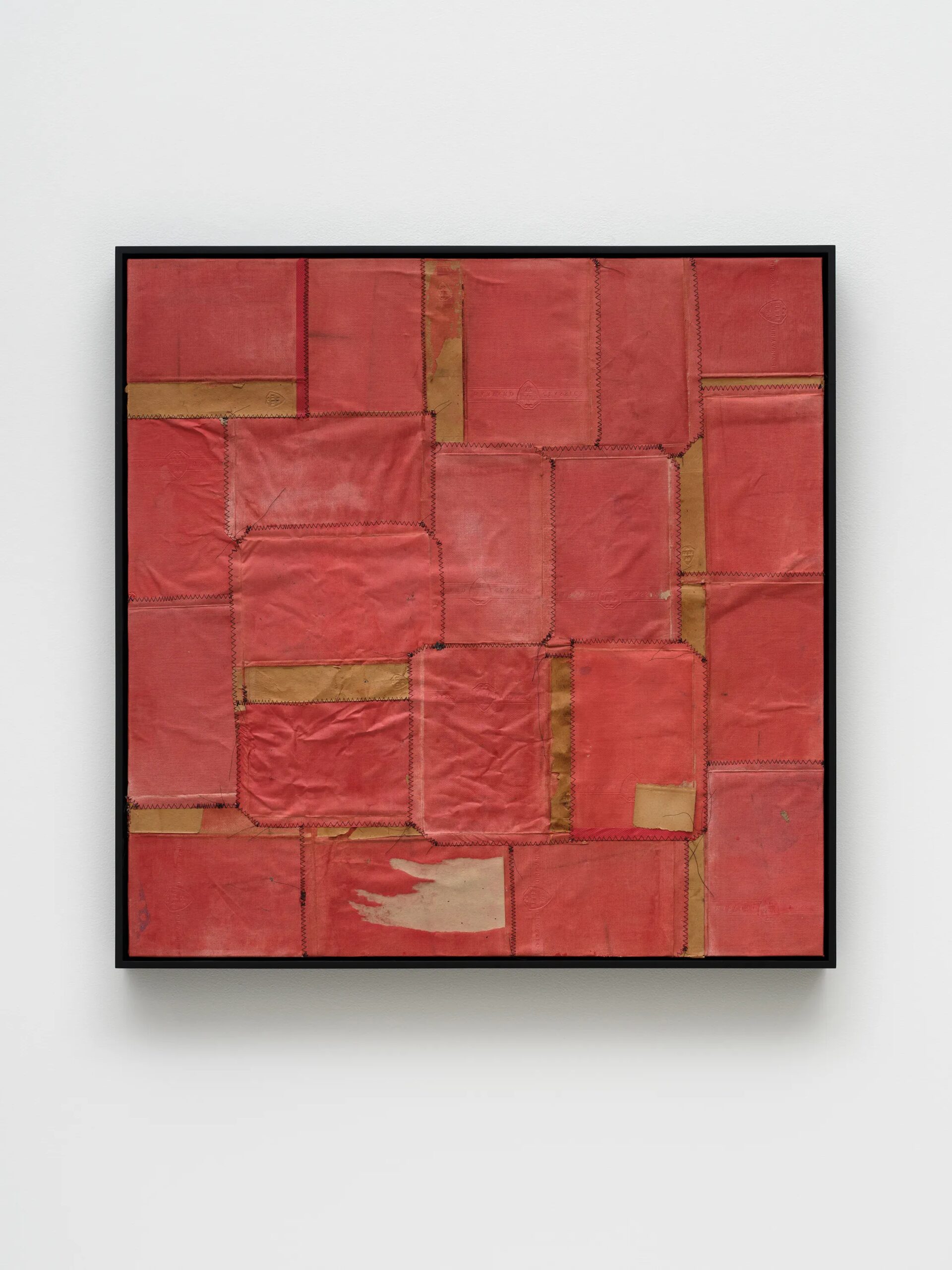 Samuel Levi Jones deconstructs and reconstitutes found legal, medical, and historical texts into layered compositions that grapple with questions of authority, representation, and recorded history. The resulting works consist of disassembled book covers sewn together and interspersed with pulped paper, producing surfaces that digest and transform their source material into grid-like fields of color and texture. Jones’s practice centers on physically undoing volumes of information, probing the existing power structures and struggles of exclusion and equality, and finally, reimagining their material components into painterly abstractions.