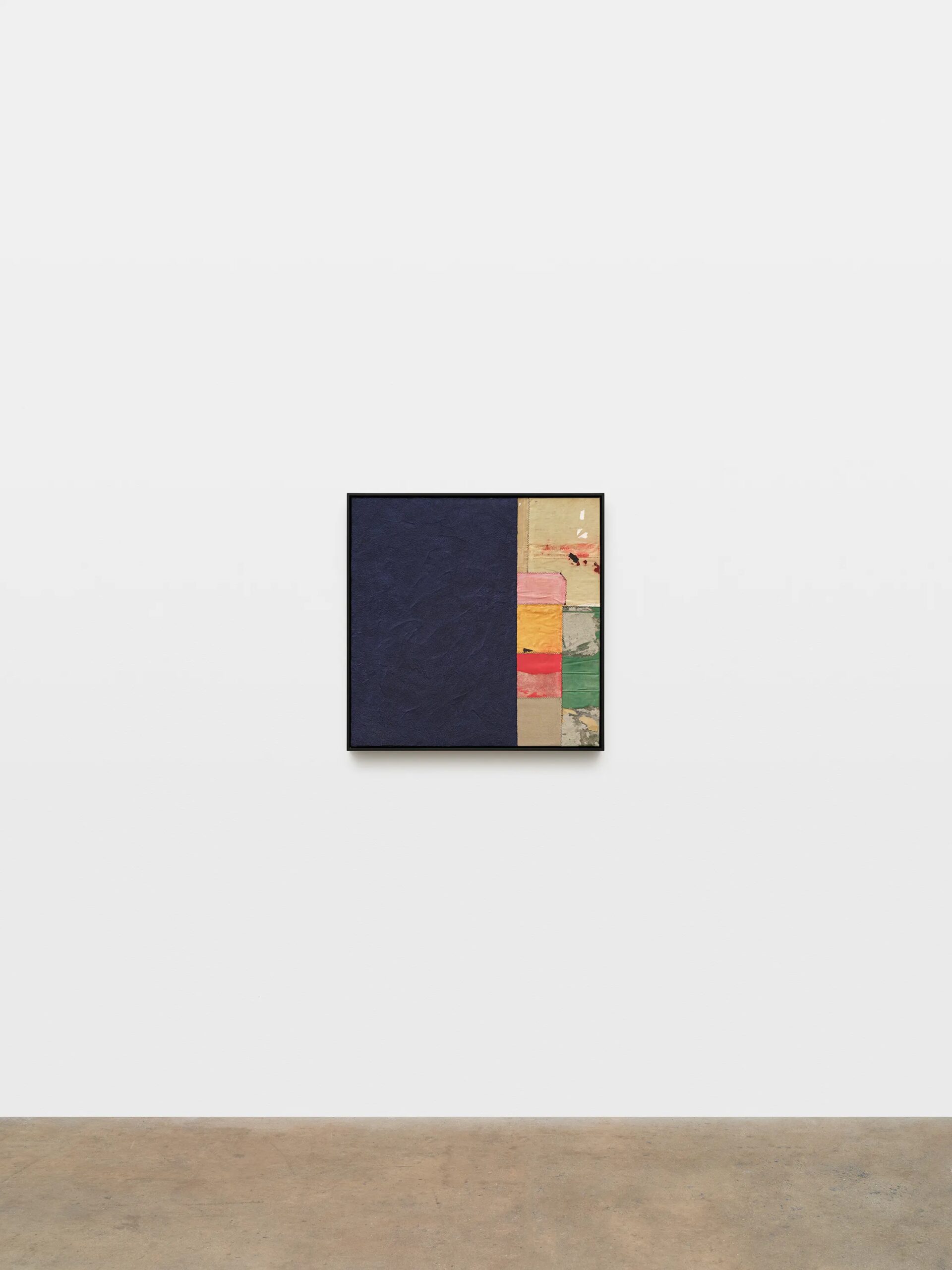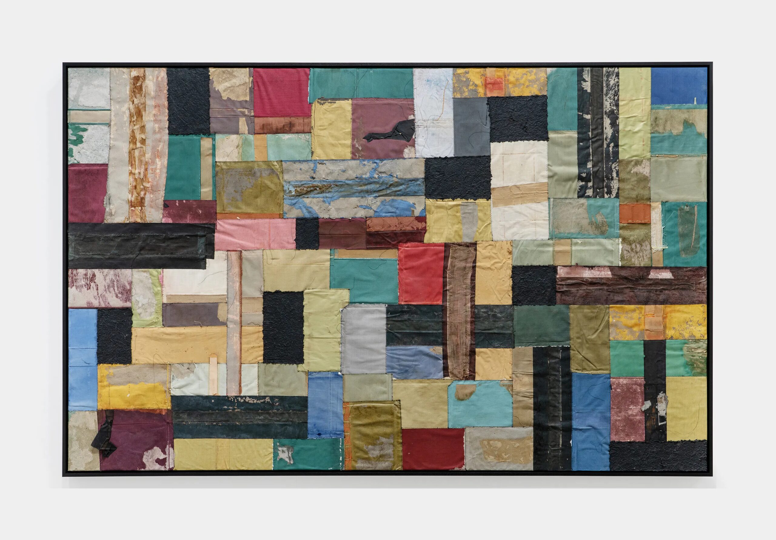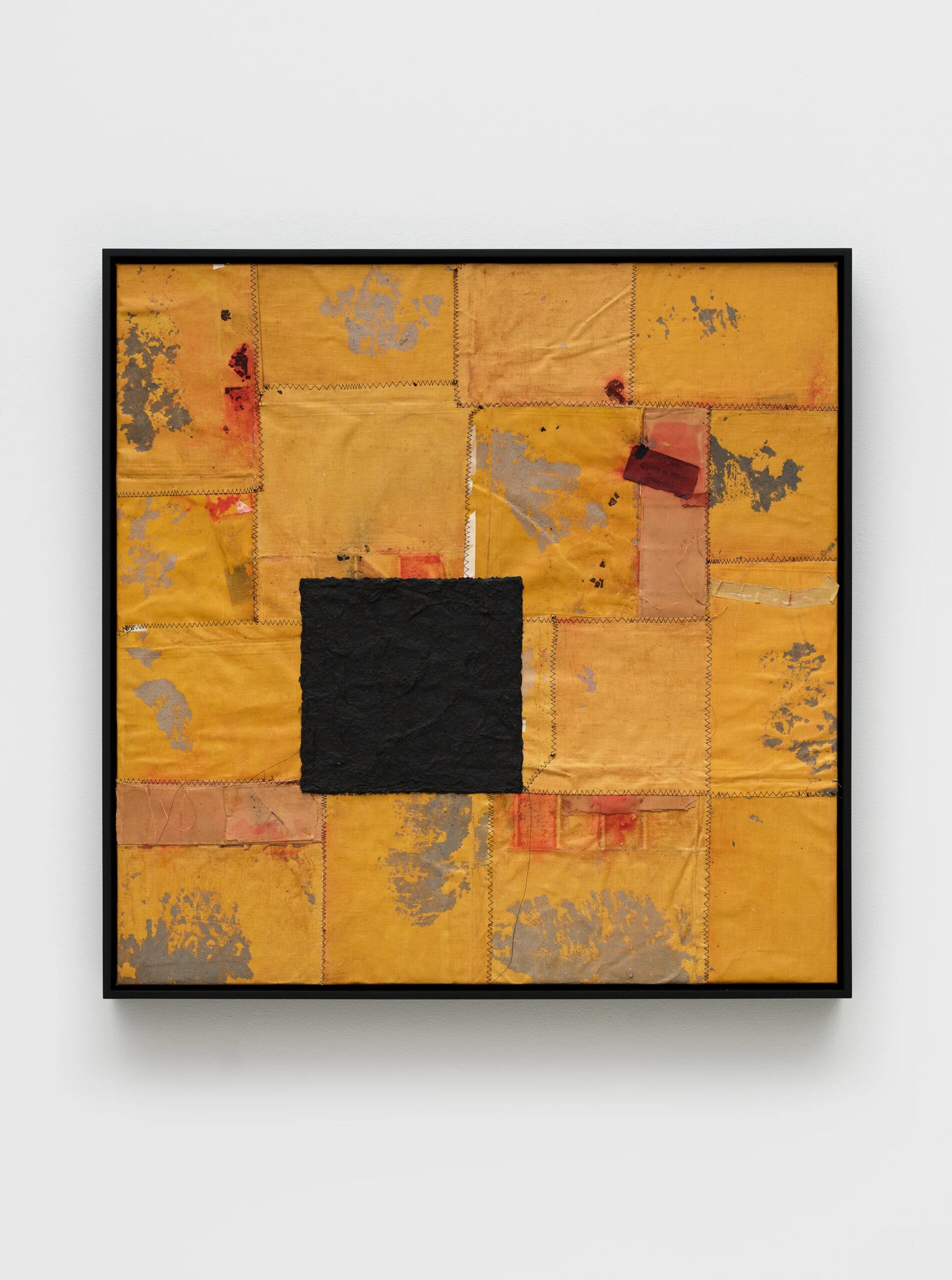 Samuel Levi Jones deconstructs and reconstitutes found legal, medical, and historical texts into layered compositions that grapple with questions of authority, representation, and recorded history. The resulting works consist of disassembled book covers sewn together and interspersed with pulped paper, producing surfaces that digest and transform their source material into grid-like fields of color and texture. Jones’s practice centers on physically undoing volumes of information, probing the existing power structures and struggles of exclusion and equality, and finally, reimagining their material components into painterly abstractions.